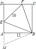 .分析:延长DA到M点,使MA=FC,连接BM,通过求证△ABM≌△CBF,推出∠CBF=∠ABM,BF=BM,再根据∠EBF=45°,依据正方形的性质可得∠ABE+∠CBF=45°,通过等量代换即可推出∠EBM=45°,根据全等三角形的判定定理(SAS),求证△FBE≌△MBE,求出EM=EF=10,然后根据CD=DA=12,设AE=x,FC=y,则DF=12-y,DE,=12-x,由Rt△DEF,依据勾股定理可推出(12-x)2+(12-y)2=102,题意列出方程组