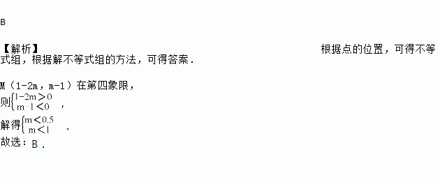 已知点M(1-2m,m-1)在第四象限,则m的取值范围在数轴上表示正确的是( )