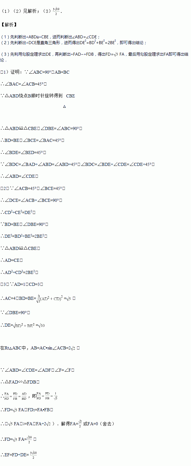 如图,在△ABC中,∠ABC=90°,AB=AC,点D在边AC上,将△ABD绕点B顺时针旋转得到△CBE,连接ED并延长交BA的延长线于点F.