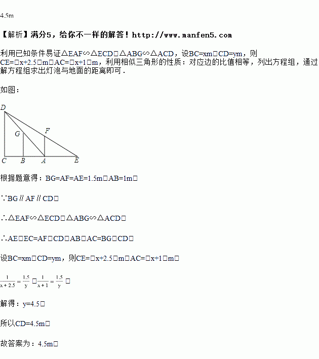 墙壁处有一盏灯(如图),小明站在处测得他的影长与身长相等都为,小明向墙壁走到处发现影子刚好落在A点,则灯泡与地面的距离________.