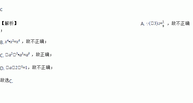 A. (﹣3)﹣2=﹣ B. x4•x2=x8 C. (a2)3•a3=a9 D. (a﹣2)0=1