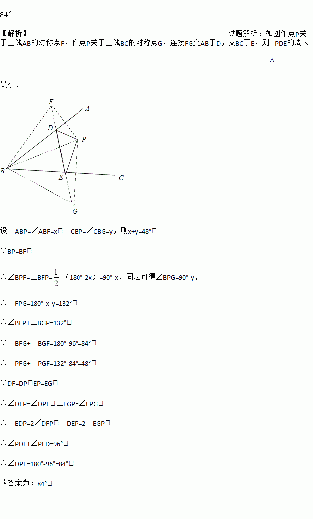 84° 【解析】试题解析:如图作点P关于直线AB的对称点F,作点P关于直线BC的对称点G,连接FG交AB于D,交BC于E,则△PDE的周长最小. 设∠ABP=∠ABF=x,∠CBP=∠CBG=y,则x+y=48°, ∵BP=BF, ∴∠BPF=∠BFP=(180°-2x)=90°-x.同法可得∠BPG=90°-y, ∴∠FPG=180°-x-y=132°, ∴∠...