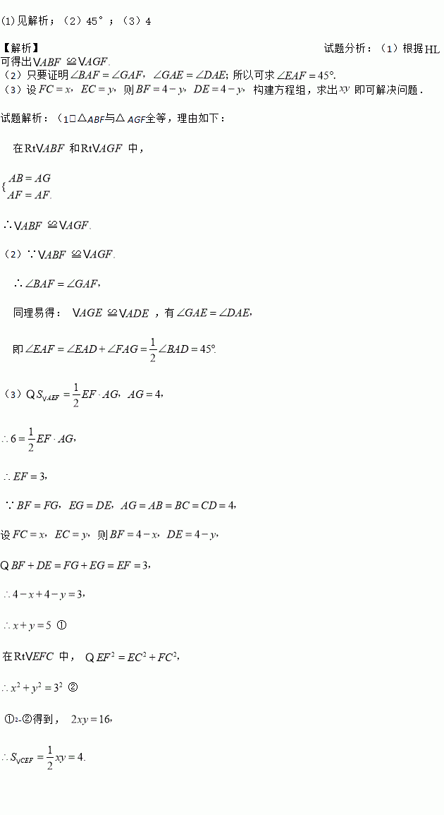 如图,在正方形ABCD中,AB=BC=CD=AD,∠BAD=∠B=∠C=∠D=90°,点E、F分别在正方形ABCD的边DC、BC上,AG⊥EF且 AG=AB,垂足为G,则: