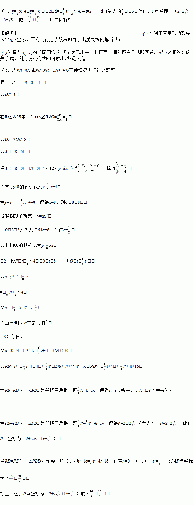 (2)设点P的横坐标为t,线段PQ的长度为d,求出d与t之间的函数关系式,并求出d的最大值;