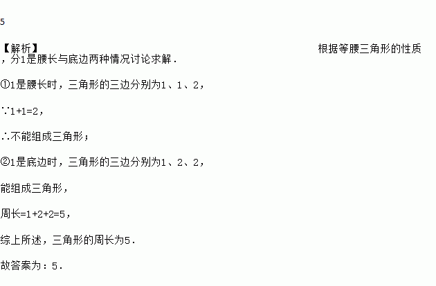 等腰三角形的两边分别为1和2,则其周长为_____.