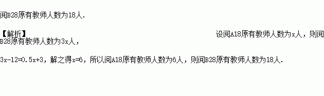 我区期末考试一次数学阅卷中,阅B卷第28题(简称B28)的教师人数是阅A卷第18题(简称A18)教师人数的3倍,在阅卷过程中,由于情况变化,需要从阅B28题中调12人到A18阅卷,调动后月B28剩下的人数比原先阅A18人数的一半还多3人,求阅B28和阅A18原有教师人数各多少人?