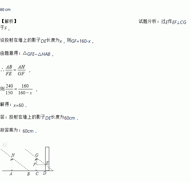 如图,小颖身高为160 cm,在阳光下影长AB=240 cm,当她走到距离墙脚(点D)150 cm处的点C时,她的部分影子投射到墙上,则投射在墙上的影子DE长度为__________.