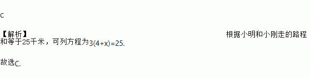 C 【解析】根据小明和小刚走的路程和等于25千米,可列方程为3(4+x)=25. 故选C.