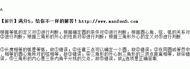 下列命题:①长度相等的弧是等弧;②任意三点可以确定一个圆;③相等的圆心角所对的弦相等;④三角形的外心到三角形的三边距离相等;⑤三角形的外心是三条内角平分线的交点;其中正确的有 ( )