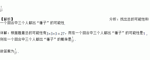甲、乙、丙三人在一起做“剪子、布、锤子”游戏,约定每个人在每一个回合中只能随机出“剪子、布、锤子”中的一个,那么在一个回合中三个人都出“锤子”的概率是_________