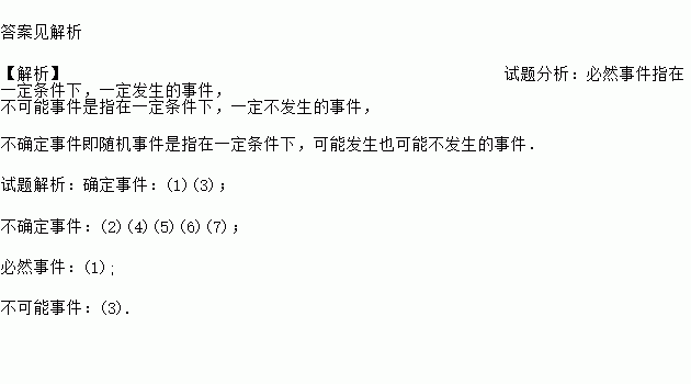 下列事件中,哪些是确定事件?哪些是不确定事件?哪些是必然事件?哪些是不可能事件?