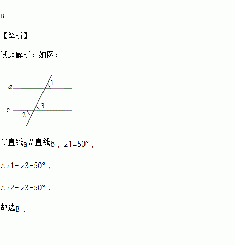 (2017•怀化)如图,直线a∥b,∠1=50°,则∠2的度数是( )
