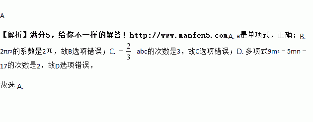 C. ﹣ abc的次数是1 D. 多项式9m2﹣5mn﹣17的次数是4