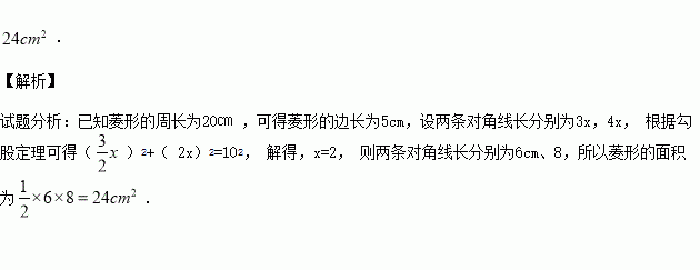 已知菱形的周长为20㎝ ,两条对角线的比为 ,则菱形的面积为___________.