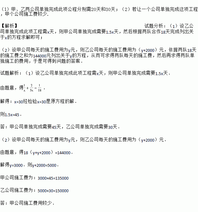 (1)甲、乙两公司单独完成此项公程分别需20天和30天;(2)若让一个公司单独完成这项工程,甲个公司施工费较少. 【解析】试题分析:(1)设乙公司单独完成此项工程需x天,则甲公司单独完成需要1.5x天,然后根据两队合作18天完成列出关于x的方程求解即可; (2)设甲公司每天的施工费用为y元,则乙公司每天的施工费用为(y+2000)元,依据两队18天的施工费之和为144000元列出关于y...