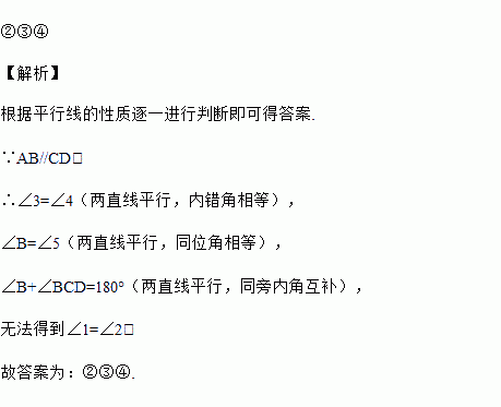 如图,若AB∥CD,则下列结论:①∠1=∠2;②∠3=∠4;③∠B=∠5;④∠B+∠BCD=180°成立的是__________(填序号)