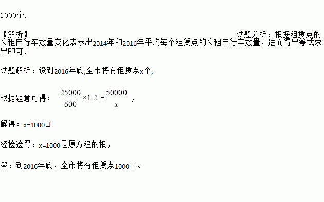 1000个. 【解析】试题分析:根据租赁点的公租自行车数量变化表示出2014年和2016年平均每个租赁点的公租自行车数量,进而得出等式求出即可. 试题解析:设到2016年底,全市将有租赁点x个, 根据题意可得: =, 解得:x=1000, 经检验得:x=1000是原方程的根, 答:到2016年底,全市将有租赁点1000个。