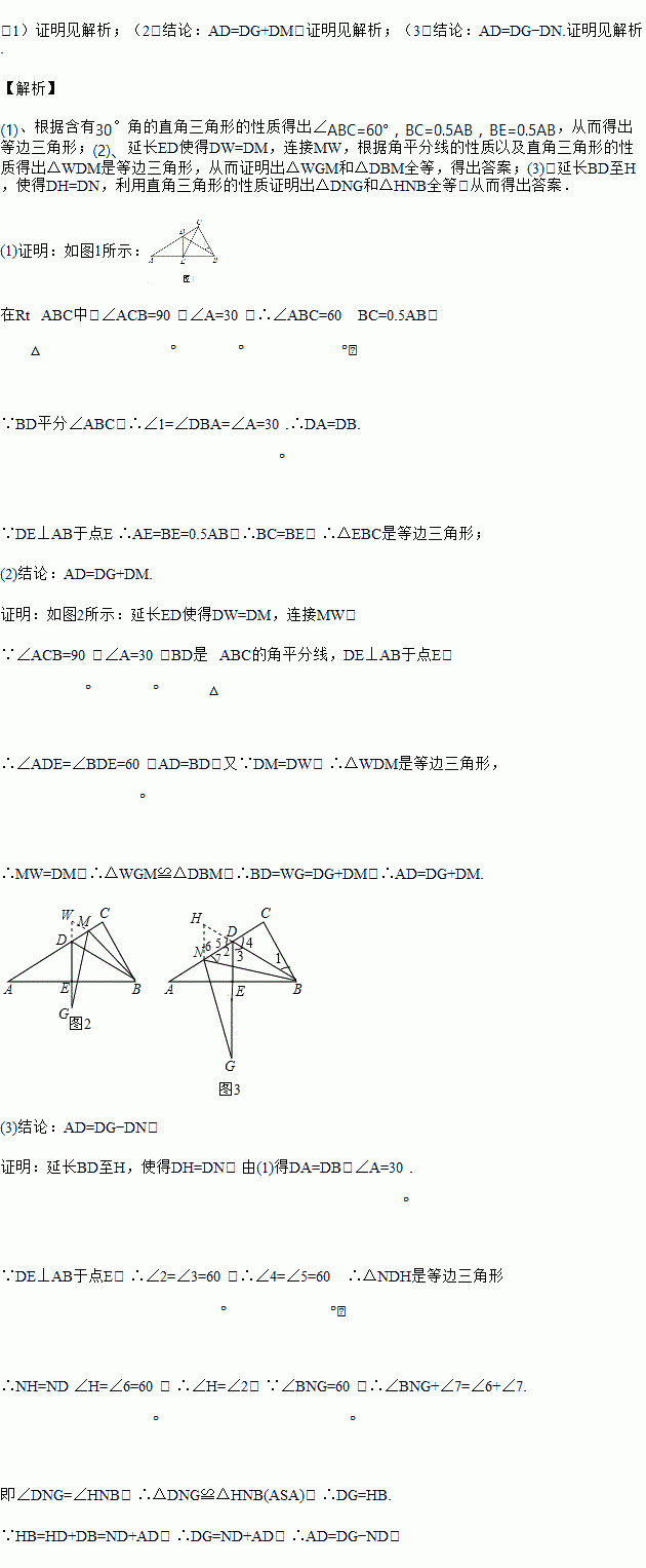 (3)点N是线段AD上的一点,以BN为一边,在BN的下方作∠BNG=60°,NG交DE延长线于点G.请在图3中画出图形,并直接写出ND,DG与AD数量之间的关系.