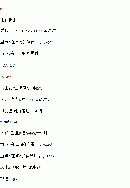 如图,AD、BC是⊙O的两条互相垂直的直径,点P从点O出发,沿O→C→D→O的路线匀速运动.设∠APB=y(单位:度),那么y与点P运动的时间x(单位:秒)的关系图是( )
