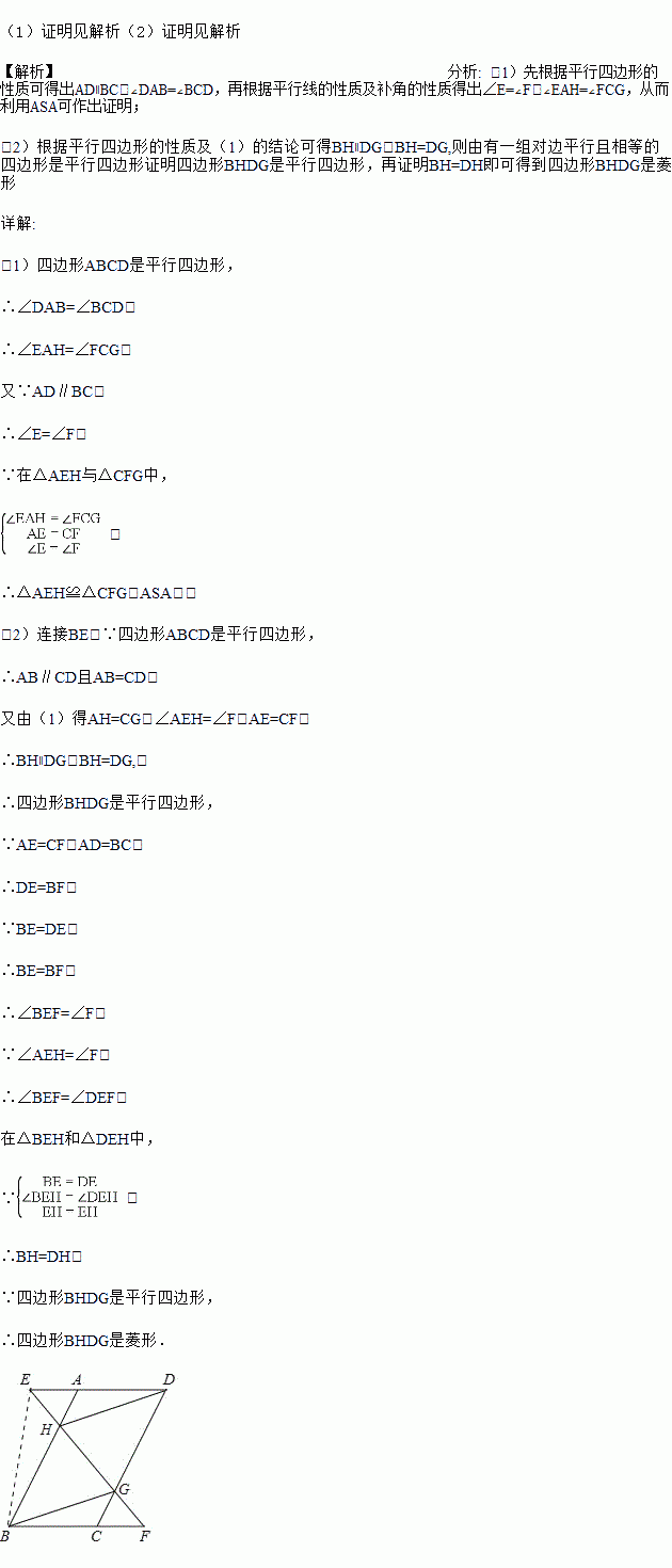 已知:如图,在?ABCD中,延长DA到点E,延长BC到点F,使得AE=CF,连接EF,分别交AB,CD于点H,G,连接DH,BG.