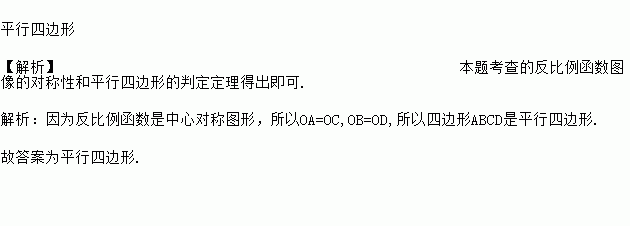 如图,直线l与双曲线交于A、C两点,将直线l绕点O顺时针旋转a度角(0°<a≤45°),与双曲线交于B、D两点,则四边形ABCD的形状一定是__.