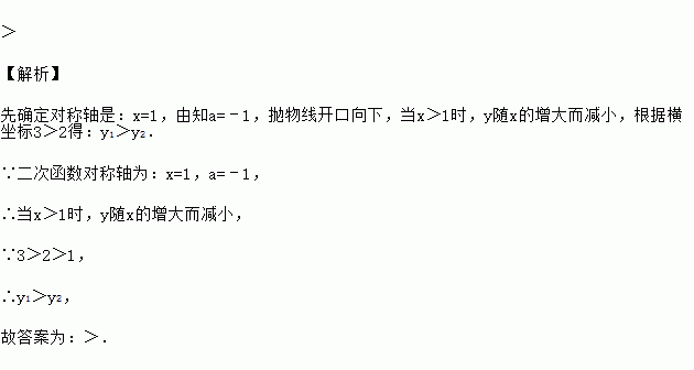 点A(2,y1)、B(3,y2)是二次函数y=﹣(x﹣1)2+2的图象上两点,则y1_____y2.