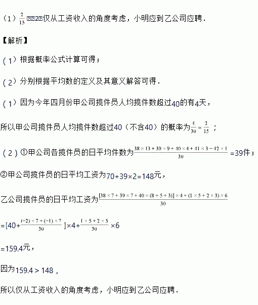 (1)现从今年四月份的30天中随机抽取1天,求这一天甲公司揽件员人均揽件数超过40(不含40)的概率;