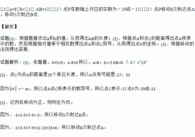 (3)若点P从原点开始第一次向左移动1个单位长度,第二次向右移动3个单位长度,第三次向左移动5个单位长度,第四次向右移动7个单位长度,…(以此类推).则点p 能移动到与点A或点B重合的位置吗?若能,请探究需要移动多少次重合?若不能,请说明理由.