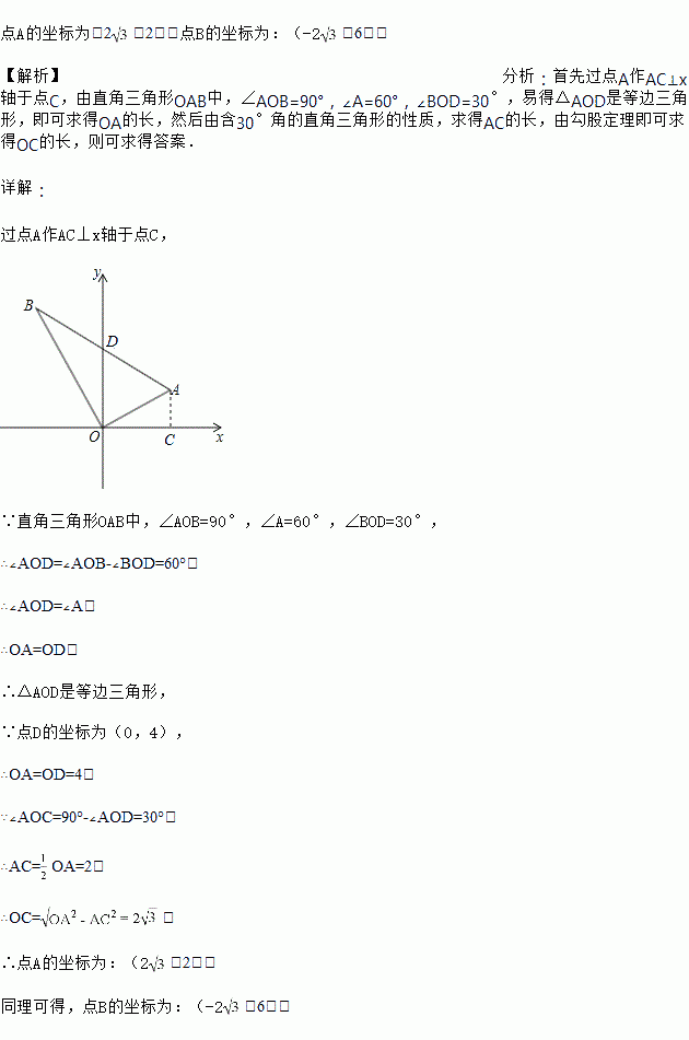 如图,直角三角形OAB中,∠AOB=90°,∠A=60°∠xOA=30°,AB与y轴的交点坐标D为(0,4)。求A、B的坐标.