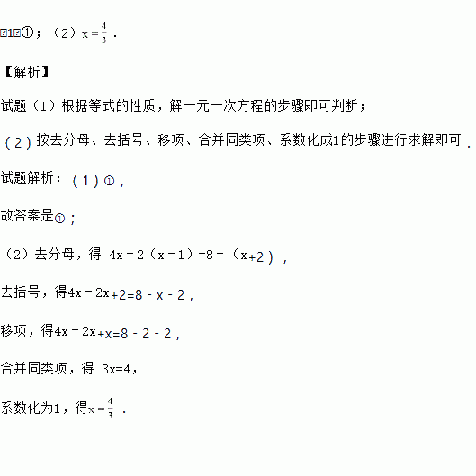 ②去括号,得 8x﹣4=1﹣3x﹣6