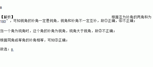 B 【解析】根据互为补角的两角和为180°,可知锐角的补角一定是钝角,锐角和补角不一定互补,故①正确,④不正确; 当一个角为钝角时,这个角的补角为锐角,钝角大于锐角,故②不正确; 根据同角或等角的补角相等,可知③正确; 故选:B.
