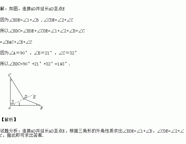 (8分)如图,∠A=90°,∠B=21°,∠C=32°,求∠BDC的度数。