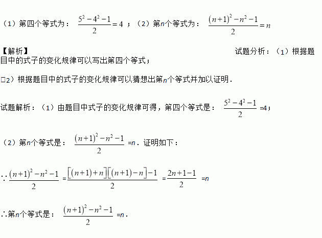 (1)第四个等式为: ;(2)第n个等式为: 【解析】试题分析:(1)根据题目中的式子的变化规律可以写出第四个等式; (2)根据题目中的式子的变化规律可以猜想出第n个等式并加以证明. 试题解析:(1)由题目中式子的变化规律可得,第四个等式是: =4; (2)第n个等式是: =n.证明如下: ∵= = =n ∴第n个等式是: =n.