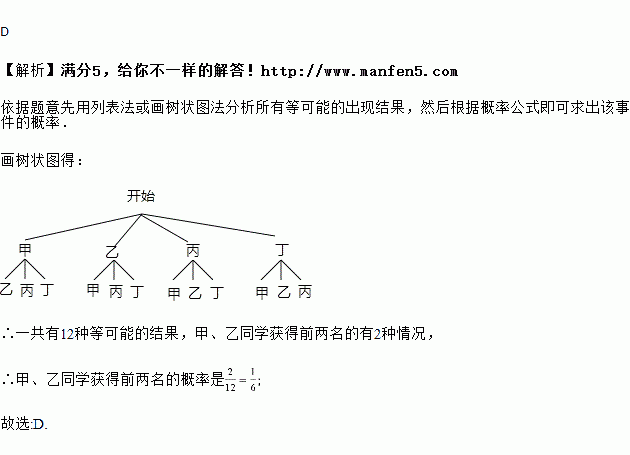 某校举行“激情五月,唱响青春”为主题的演讲比赛,决赛阶段只剩下甲、乙、丙、丁四名同学,则甲、乙同学获得前两名的概率是( )