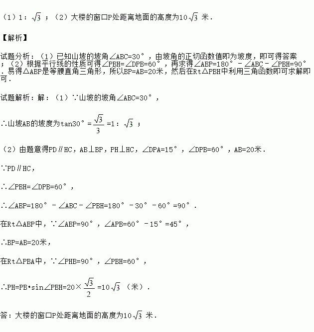 (2)若山坡AB的长为20米,求大楼的窗口P处距离地面的高度.