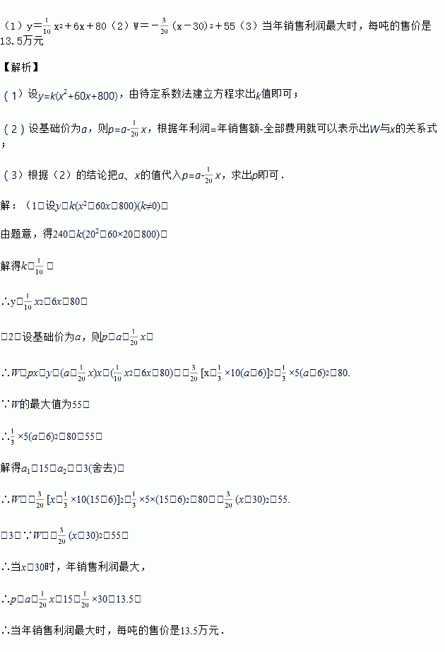 .在营销中发现年产量为20吨时,所需的成本是240万元,并且年销售利润W(万元)的最大值为55万元.(注:年利润=年销售额-成本)