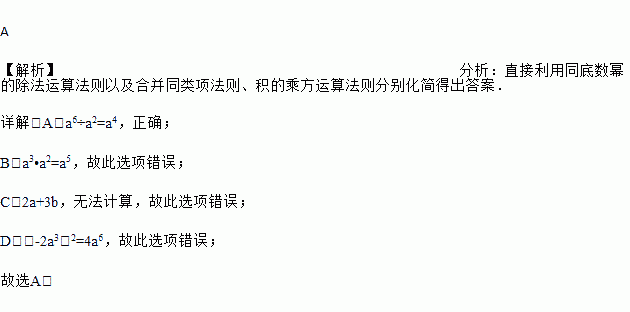 A. a6÷a2=a4 B. a3•a2=a6 C. 2a+3b=5ab D. (﹣2a3)2=﹣4a6