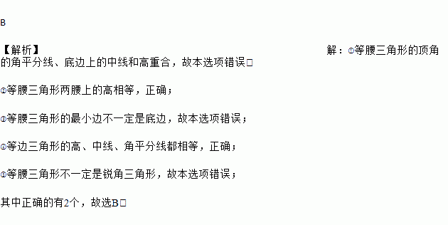 B 【解析】【解析】 ①等腰三角形的顶角的角平分线、底边上的中线和高重合,故本选项错误; ②等腰三角形两腰上的高相等,正确; ③等腰三角形的最小边不一定是底边,故本选项错误; ④等边三角形的高、中线、角平分线都相等,正确; ⑤等腰三角形不一定是锐角三角形,故本选项错误; 其中正确的有2个,故选B.