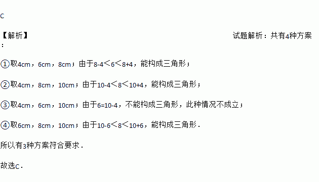C 【解析】试题解析:共有4种方案: ①取4cm,6cm,8cm;由于8-4<6<8+4,能构成三角形; ②取4cm,8cm,10cm;由于10-4<8<10+4,能构成三角形; ③取4cm,6cm,10cm;由于6=10-4,不能构成三角形,此种情况不成立; ④取6cm,8cm,10cm;由于10-6<8<10+6,能构成三角形. 所以有3种方案符合要求. ...