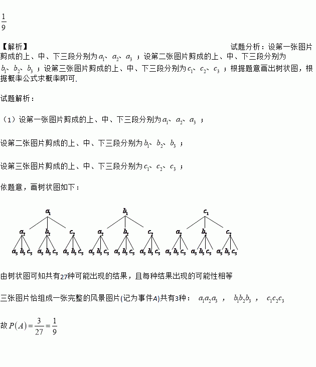 【解析】试题分析:设第一张图片剪成的上、中、下三段分别为;设第二张图片剪成的上、中、下三段分别为;设第三张图片剪成的上、中、下三段分别为;根据题意画出树状图,根据概率公式求概率即可. 试题解析: (1)设第一张图片剪成的上、中、下三段分别为; 设第二张图片剪成的上、中、下三段分别为; 设第三张图片剪成的上、中、下三段分别为; 依题意,画树状图如下: 由树状图可知...