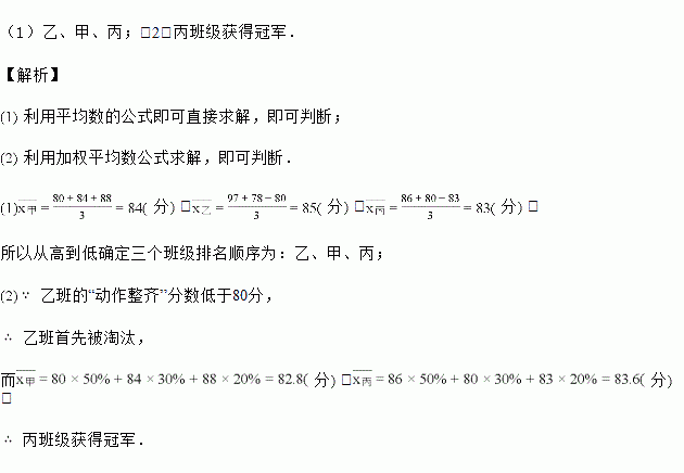 某校在一次广播操比赛中,甲、乙、丙各班得分如下表: