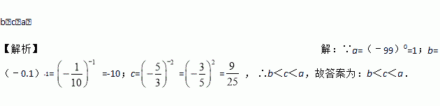 将a=(﹣99)0 ,b=(﹣0.1)﹣1 ,c=,这三个数从小到大的顺序排为________.