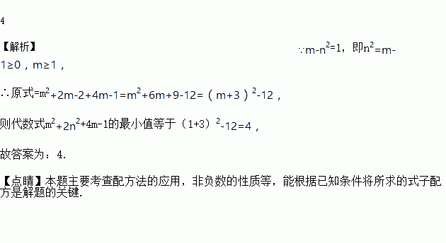 已知实数m,n满足m﹣n2=1,则代数式m2+2n2+4m﹣1的最小值等于__.