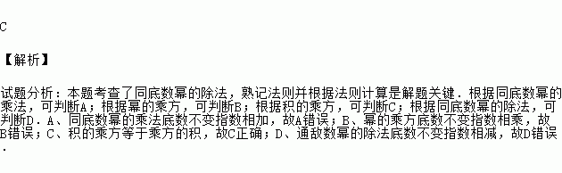 C 【解析】 试题分析:本题考查了同底数幂的除法,熟记法则并根据法则计算是解题关键.根据同底数幂的乘法,可判断A;根据幂的乘方,可判断B;根据积的乘方,可判断C;根据同底数幂的除法,可判断D.A、同底数幂的乘法底数不变指数相加,故A错误;B、幂的乘方底数不变指数相乘,故B错误;C、积的乘方等于乘方的积,故C正确;D、通敌数幂的除法底数不变指数相减,故D错误.