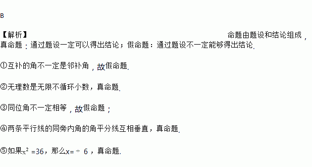 ①互补的角是邻补角;②无理数是无限不循环小数;③同位角相等;④两条平行线的同旁内角的角平分线互相垂直;⑤如果=36,那么x=6.