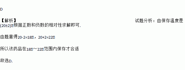 D 【解析】试题分析:由保存温度是(20±2)℃根据正数和负数的相对性求解即可. 由题意得20-2=18℃,20+2=22℃ 所以该药品在18℃~22℃范围内保存才合适 故选D.
