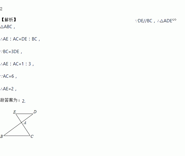 已知点D、E分别在△ABC的边BA、CA的延长线上,且DE∥BC,如果BC=3DE,AC=6,那么AE=_____.