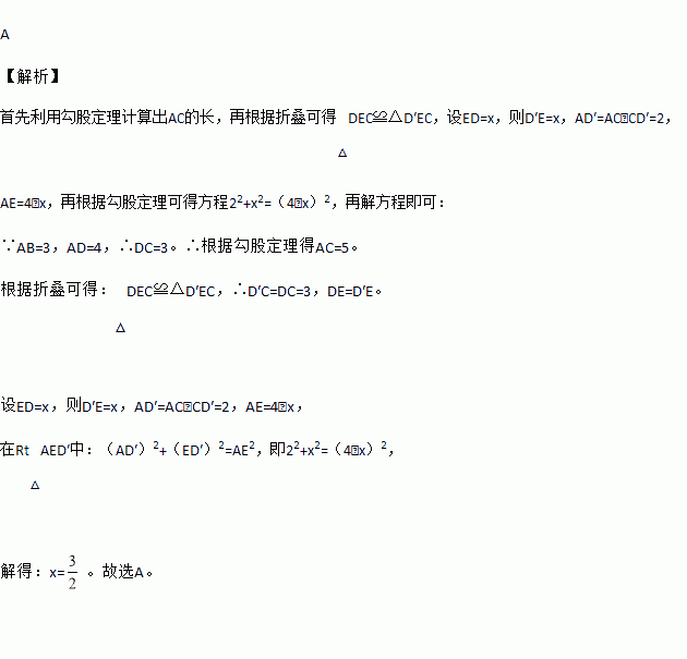如图,将长方形纸片ABCD折叠,使边DC落在对角线AC上,折痕为CE,且D点落在对角线D′处.若AB=3,AD=4,则ED的长为