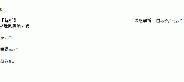 B 【解析】试题解析:由-5x6y3与2x2ny3是同类项,得 2n=6, 解得n=3. 故选B.
