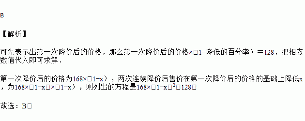 上海世博会的某纪念品原价168元,连续两次降价后售价为128元. 若设每次平均降低的百分数为x,则下列所列方程中正确的是( )